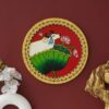 This hand-painted pichwai depicts a sacred cow sitting on a lotus flower. The cow is a symbol of fertility, abundance, and motherhood in Hinduism, and the lotus flower is a symbol of purity and enlightenment. The painting is made with natural pigments on cotton cloth, and it is framed in a traditional wooden frame. This unique piece of art would be a beautiful addition to any home.
